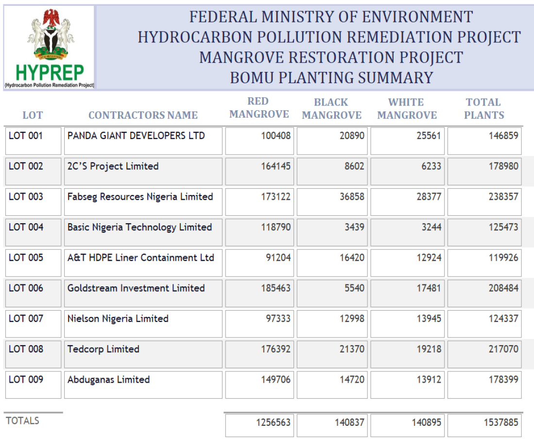Mangrove Planting in Bomu is HYPREP pilot planting project. Due to previous oil spill impacts and artisanal refining mangrove losses occurred. Some areas over time natural attenuation has occurred. Using remote sensing, HYPREP has delineated areas requiring direct Planting of mangroves, areas were divided into 9 LOTs and contracted out. Removal of Nipa palm, raking, tilling of sediment and Planting of mangrove seedlings (3 species) will be done by all contractors in their Grids.